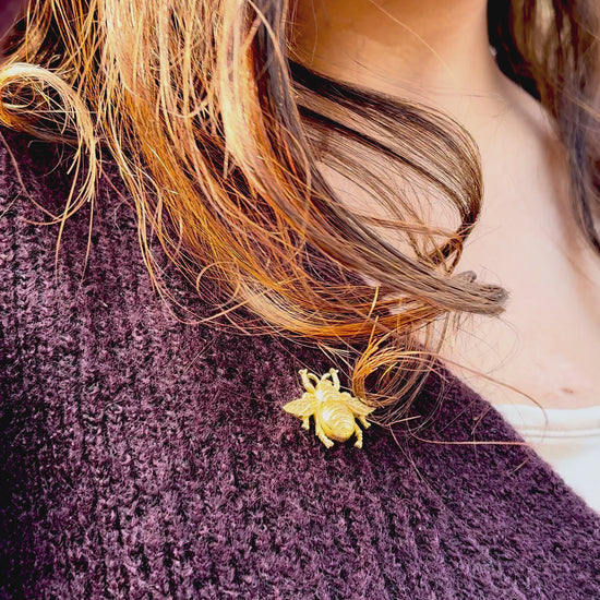 Crafted in brass with 18kt gold plating, this bumble bee brooch button reflects constant movement and focus. Designed for those who notice the details that others overlook.